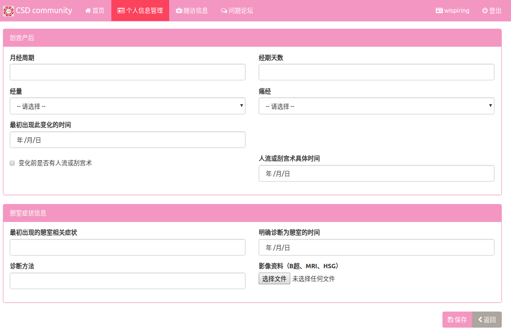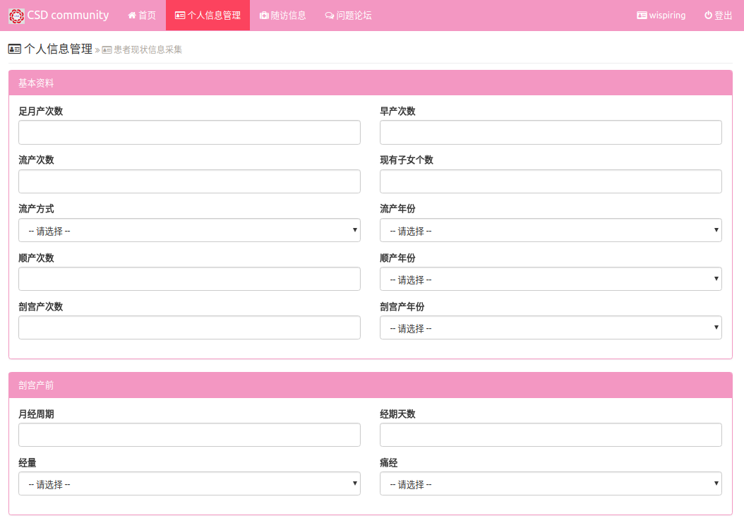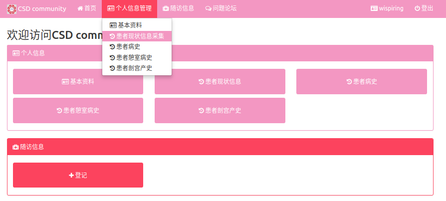 或者点击 “个人信息管理” 导航下的 “患者现状信息采集” 进入填写页面。